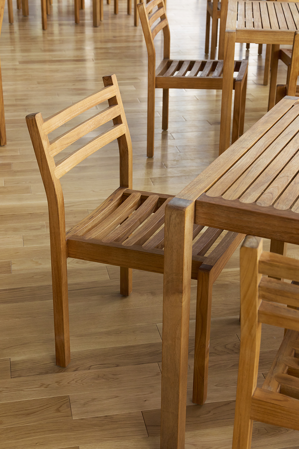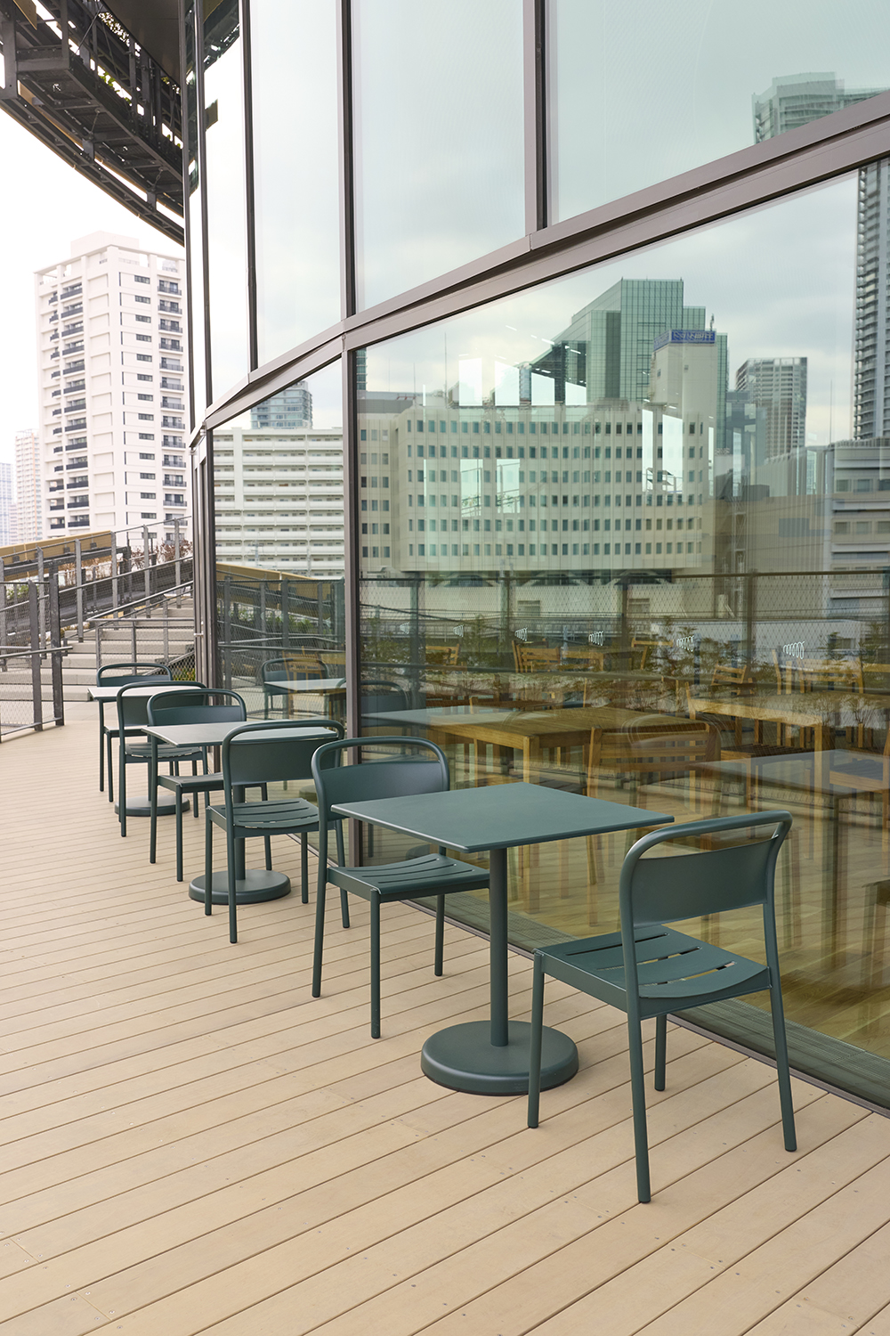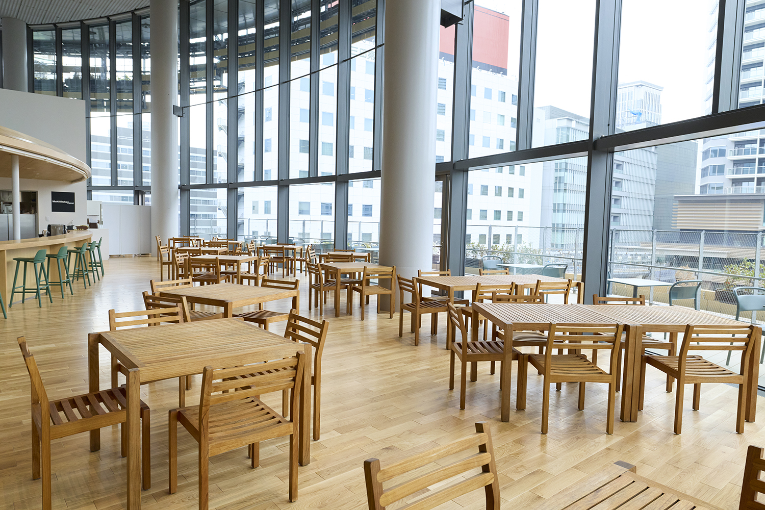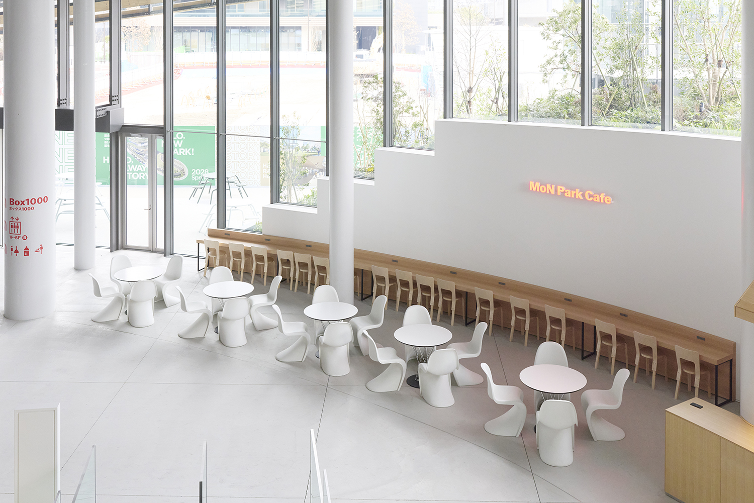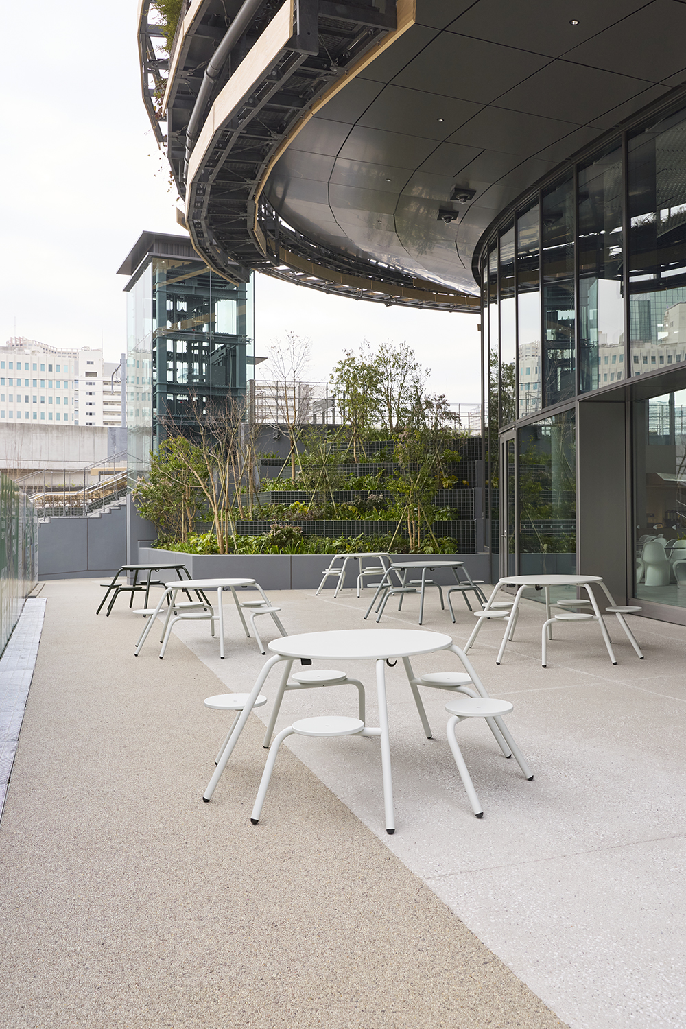 Furniture previously used at Expo 2025 Osaka, Kansai was repurposed and incorporated into the project as part of a circular approach. On the first floor, the Mon Park Café features furniture by Vitra that was used in the Swiss Pavilion’s “Heidi Café.” On the third floor, Mon Kitchen adopts outdoor furniture by Carl Hansen & Søn, originally used on the rooftop terrace of the Nordic Pavilion. In addition, selected pieces were repaired and reintroduced by Interoffice, further reinforcing a sustainable cycle of use.