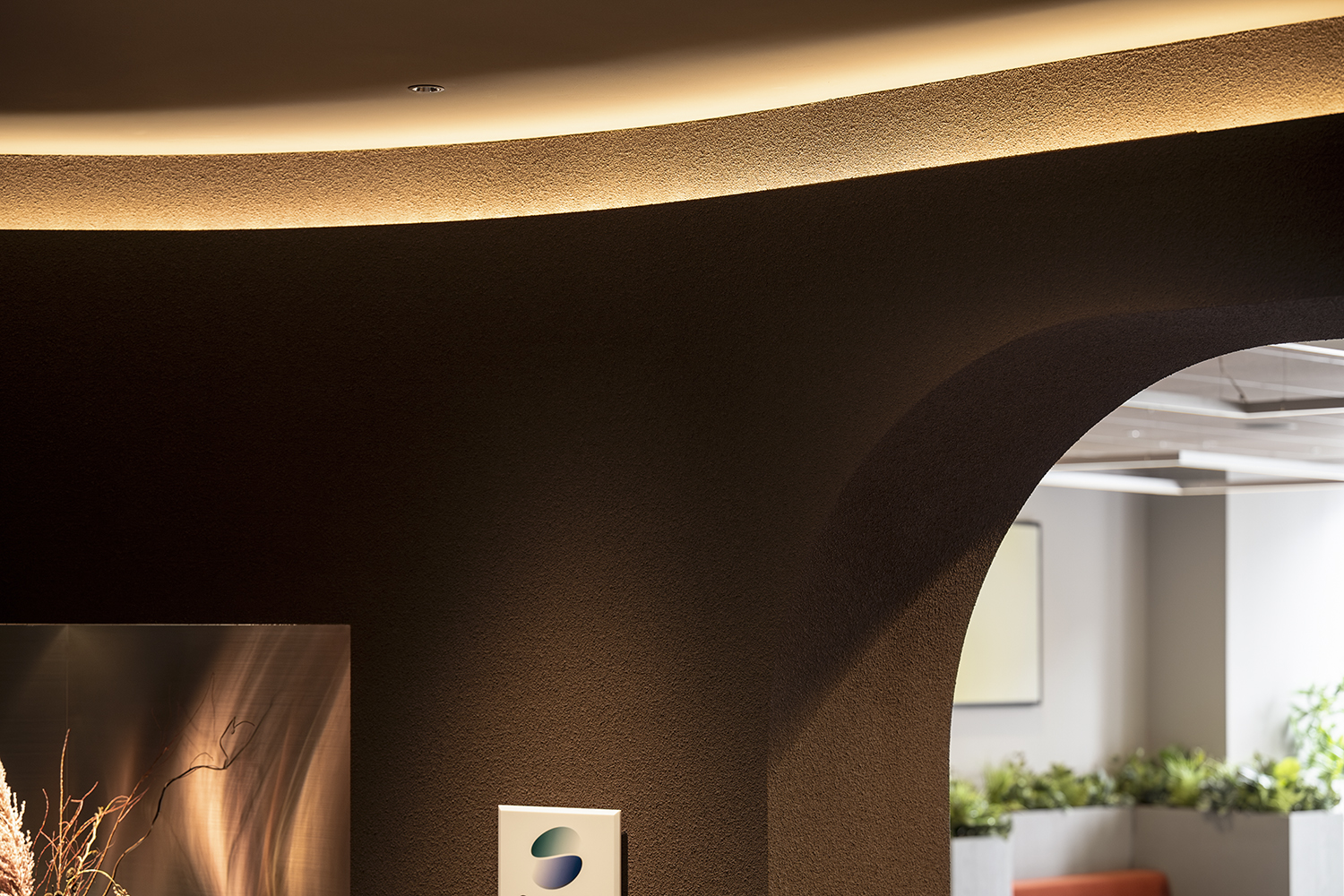 The lounge is unified in deep brown tones to create a sense of calm and sophistication. Soft curves are incorporated throughout the space, guiding the eye and movement naturally and helping visitors relax.