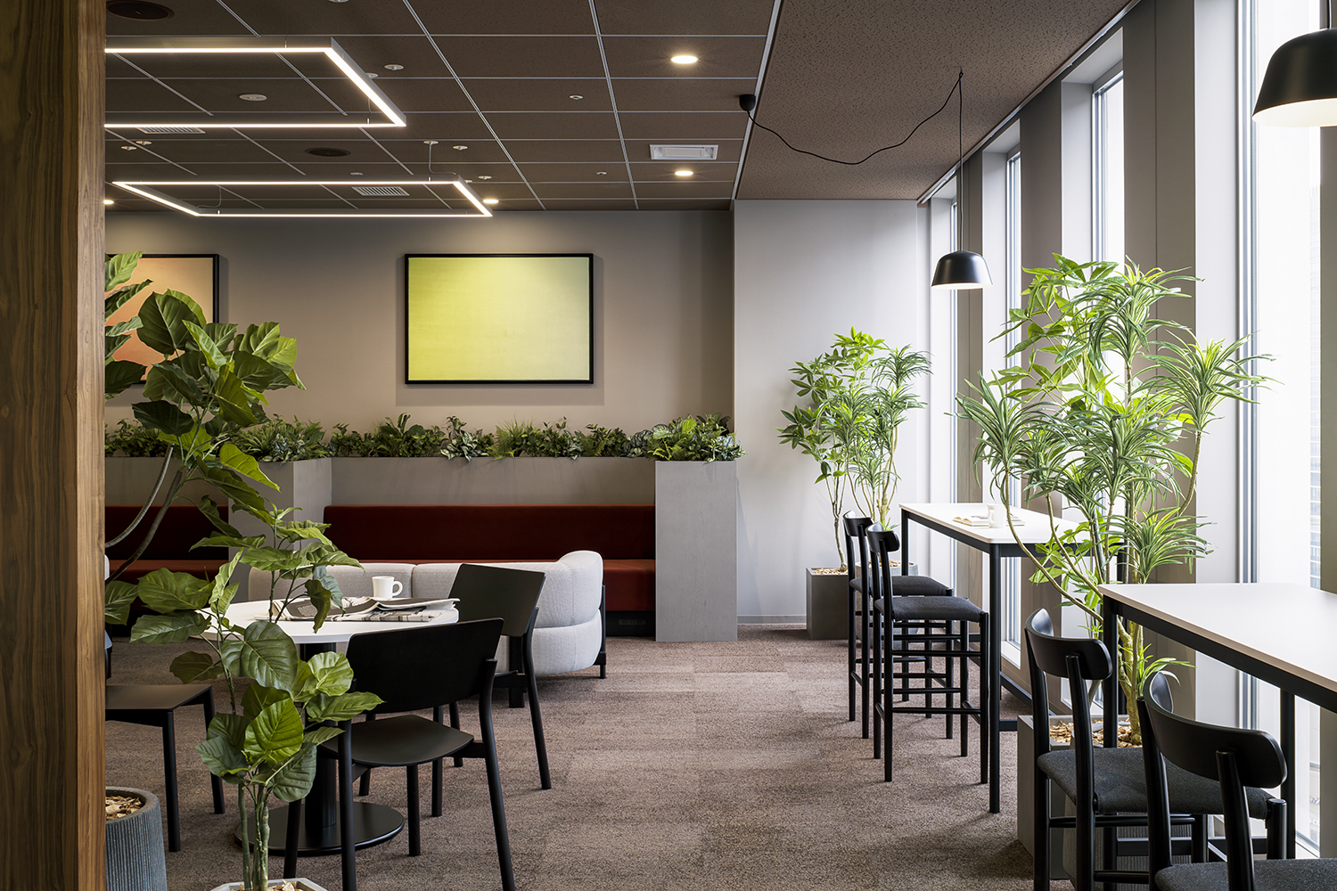 This project involved creating a new lounge space in a high-rise building in Umeda, Osaka. Interoffice was responsible for interior design, construction work, built-in furniture, and the delivery of loose furniture. The goal was to design a space where clients can be welcomed in a calm, quiet atmosphere away from the noise of the city.