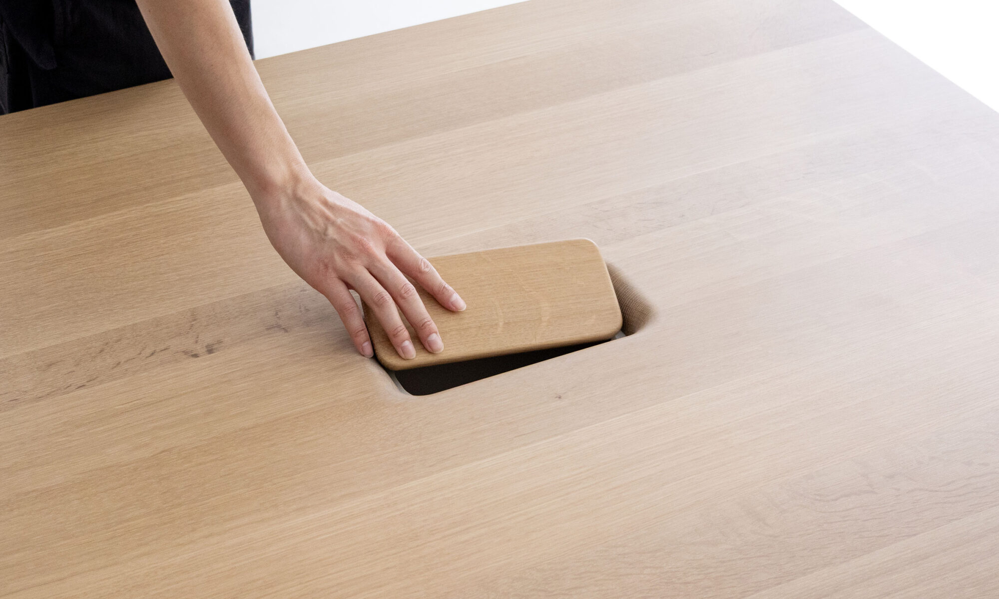 特徴的なのは、河川で角が取れた小石のようにやわらかな丸みを帯びた配線蓋と、太く安定感のある中間脚。手のひらから伝わる木の質感とディテールが、人と空間をやさしくつなぎ、快適に働くための新たな場を提案いたします。